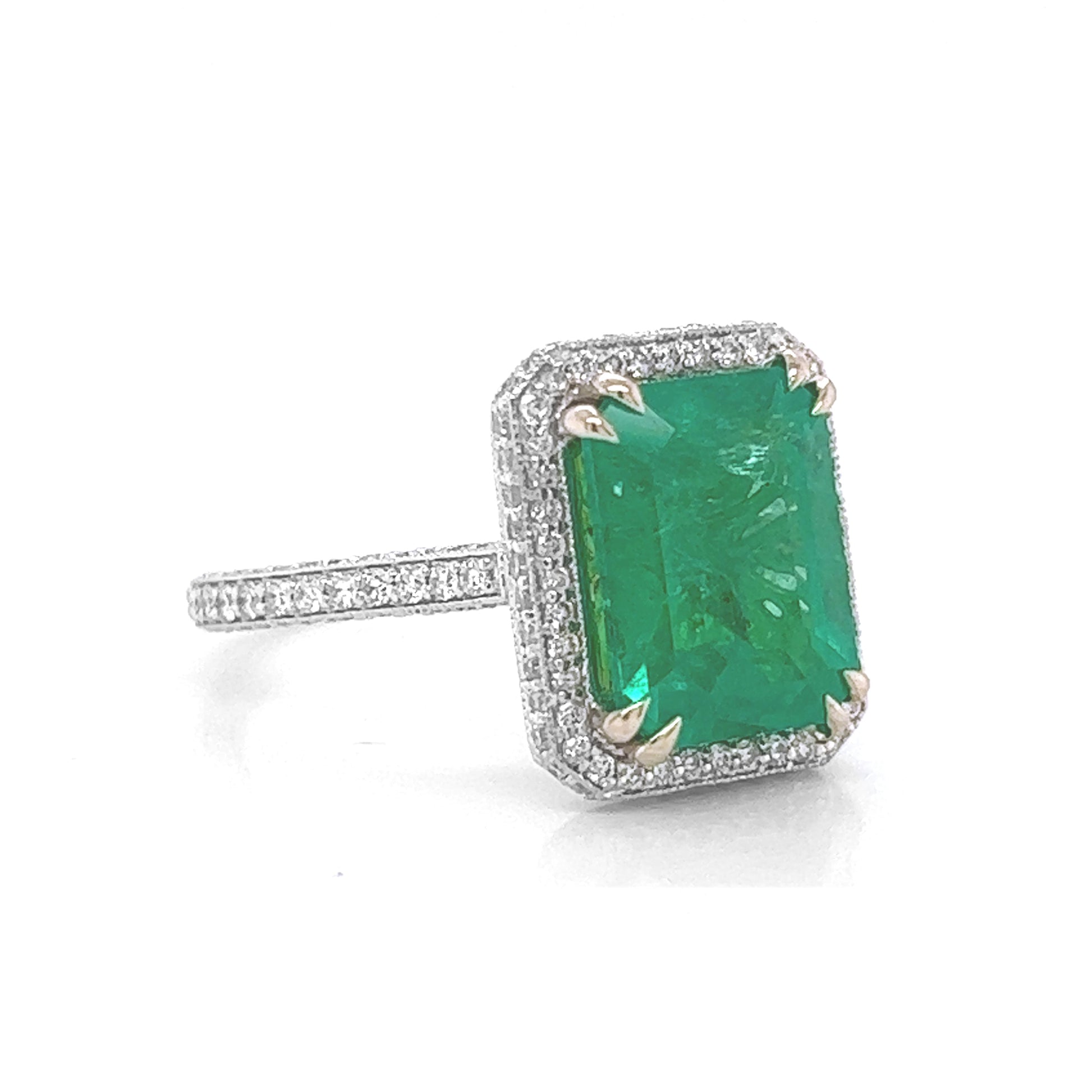 5 Carat Natural Mined Green Emerald with Natural Mined 1.10 Carat Round Diamonds 18KT White Gold Ring